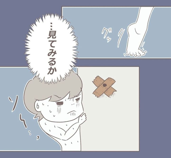 ちなきちさんは、ある日玄関の扉に穴を見つけます。明らかに穴の先が見通せてしまうほどの大きな穴です。しかしちなきちさんは、この穴をガムテープでふさぐだけの対応で済ませてしまいました。この穴を見つけた時点でもっと気を付けたり、誰かに相談すべきだったのかもしれません。