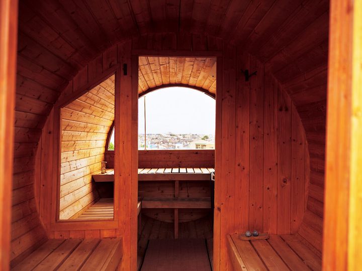 「バレルサウナ」は奥行き4m×直径2mの広さ。檜材を使った本格エストニア式サウナ