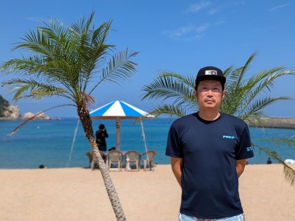 「海の家 朝日屋」は9月1日(日)まで営業しています。 「きれいな砂浜が自慢です。快適な海の家を是非利用してください。」と3代目の金田(かねだ)さん。
