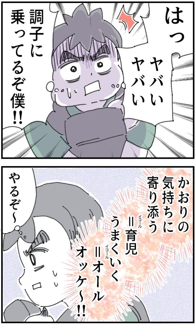 「でっへへ~!これくらいちょちょいのちょいだよぉ~!!」と答えた後で「はっ!ヤバいヤバい!調子に乗ってるぞ僕!!」といちろうさんは我に返りました。「かおりの気持ちに寄り添う=育児うまくいく=オールオッケー~!!」と頭の中で育児の数式を導いたいちろうさんは「やるぞ~」と気合いを入れ直します。