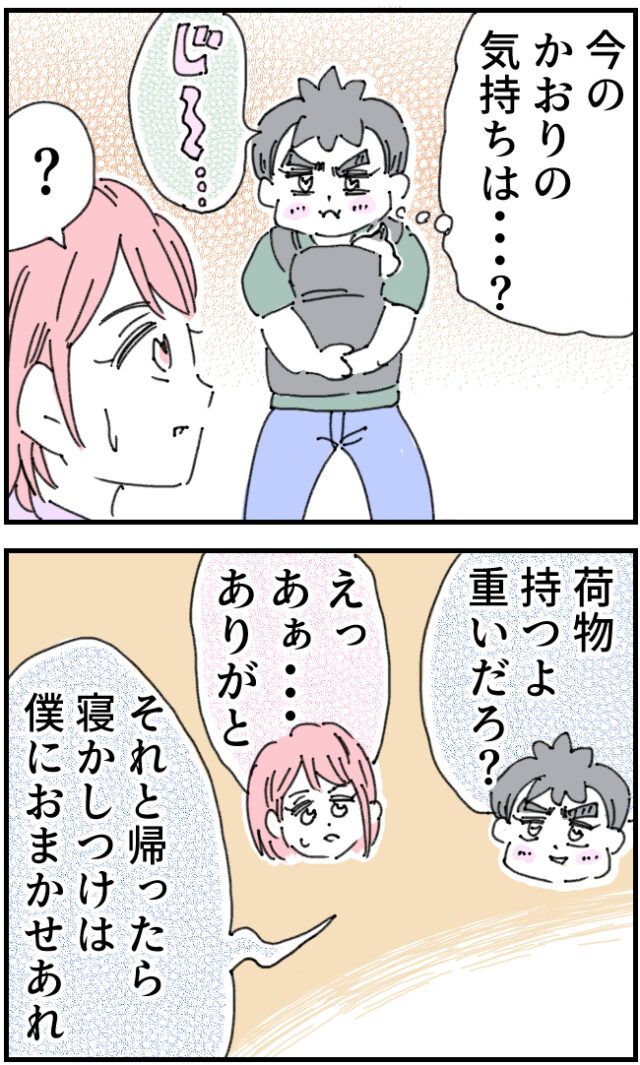 そして「今のかおりの気持ちは・・?」かおりさんの気持ちを読み取ろうとじ~っと見つめるいちろうさん、その様子を見て「?」とかおりさんが不思議に思っていると、「荷物持つよ。思いだろ?それと、帰ったらこはるの寝かしつけは僕におまかせあれ」いちろうさんにそう言われて「えっ、あぁ・・ありがと」かおりさんは戸惑いながら答えました。