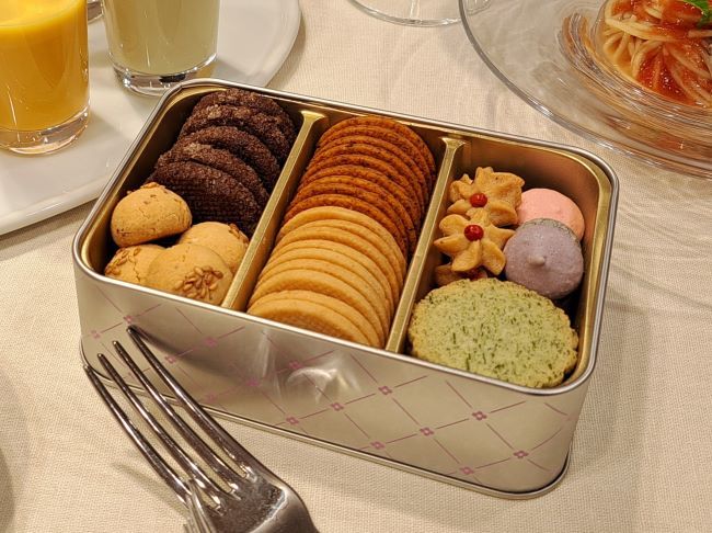 「カフェタナカ」からは、お酒やハーブティーなどに合う夏季限定のクッキー缶「ビジュード・ビスキュイ(プティ・サレ&シュクレ)」(1缶3,456円)が登場。フランス語でサレは塩、シュクレは砂糖入りの甘い生地を意味する通り、スジアオノリやクミン、胡椒などのスパイスとほんのり広がる甘さのマリアージュが絶妙でした。