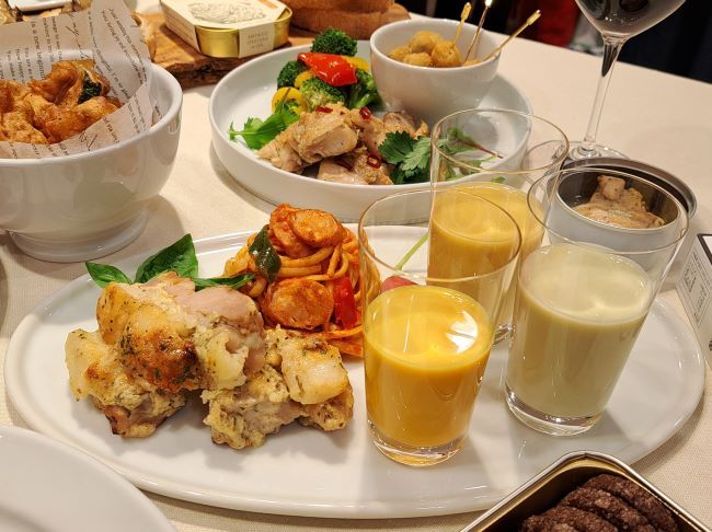 楕円のお皿に乗っているのは「ベジテリア・RF1」の「チキンとポテトのチーズ焼き」(ハーフ303円)、「たっぷりトマトの味わいナポリタン」(ハーフ372円)、冷製の「ポタージュ」(各1個293円)。ポタージュはパウチで販売されるのだそう。持ち帰って盛り付ければ、ちょっとしたパーティー仕様になりますね。