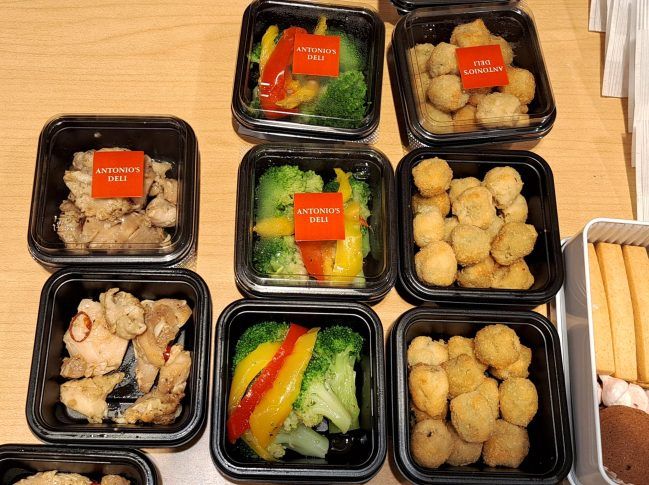 左から「アントニオズデリ」の「若鶏のガーリックペペロンチーノ」、「ブロッコリーアンチョビソース」、「オリーブフリット生ハム」(各1個330円)。お酒に合うように塩やスパイスが効いていました。