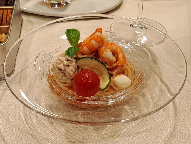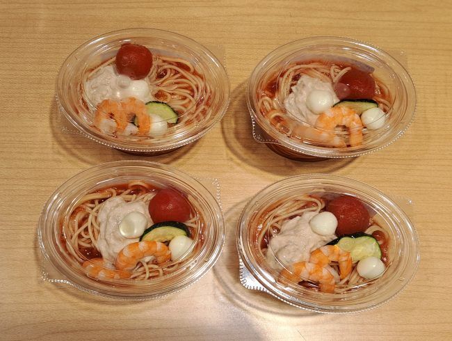 こちらは「なだ万厨房」の「冷製トマトスープの和風カッペリーニ」(1個594円)。サッパリと食べやすく絶品! 昆布だしと醤油、みりんなどで味付けしたトマトスープ味の和風パスタで、料亭のチャレンジが詰まった一品です。