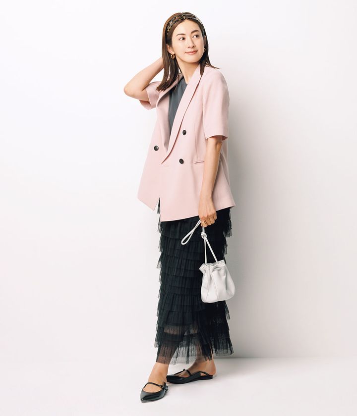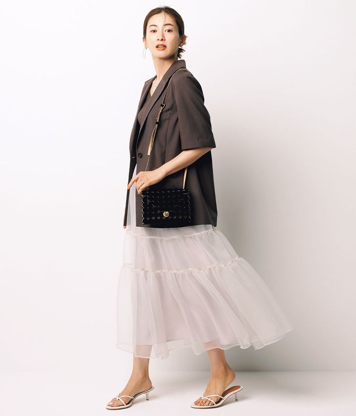 ジャケット¥27,500(カデュネ)タンクトップ¥6,380(ルーニィ)チュールスカート¥20,900(アルページュストーリー)バッグ¥33,000(メアリ オル ターナ/AL Design Inc.)サンダル¥35,200(PIPPICHIC/ベイジュ)イヤカフ[左耳]¥1,880イヤカフ[右耳]¥1,980(ともにヘンカ/ロードス)ネックレス¥59,400(ブランイリス/ブランイリス トーキョー)