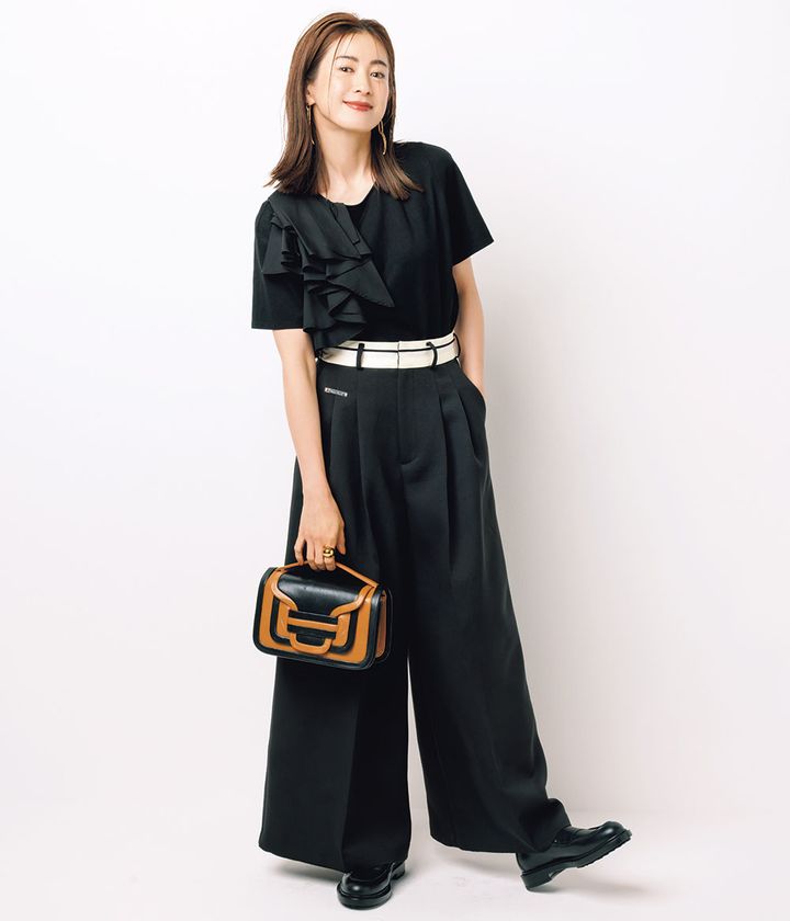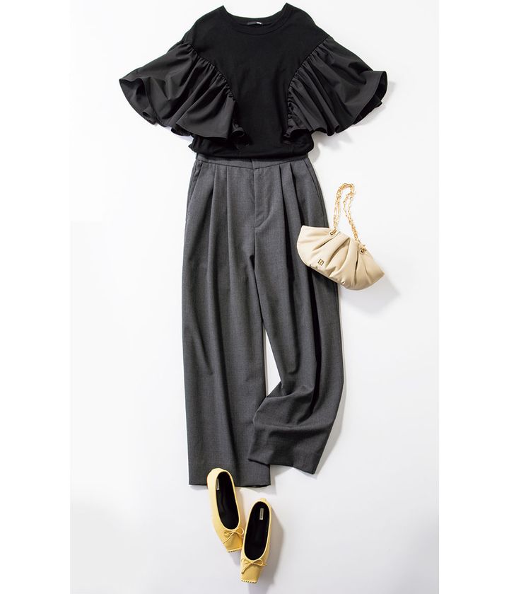 カットソー¥13,200(styling//styling/ ルミネ新宿1店)ワイドパンツ¥46,200(エイトン/エイトン青山)バッグ¥13,200(ル・ベルニ/キャセリーニ)パンプス¥34,100(チェンバー/クルーズ ショールーム)