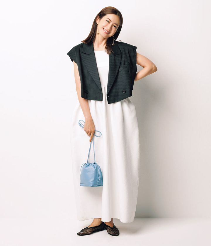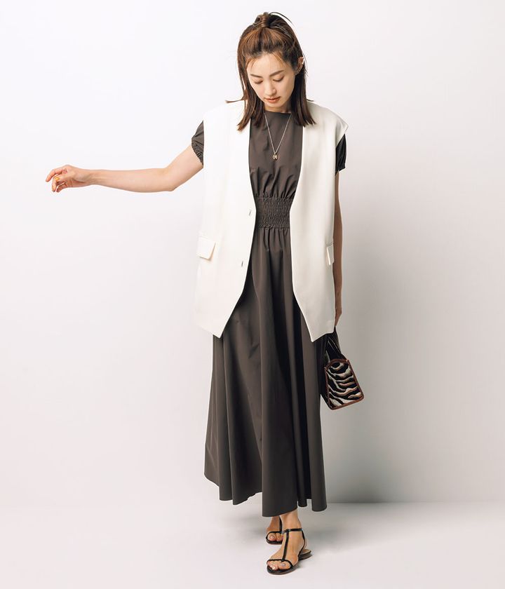 ジレ¥24,200(メゾンスペシャル/メゾンスペシャル 青山店)ワンピース¥37,400(セテンス)バッグ¥17,600(ドレステリア/ドレステリア 渋谷スクランブルスクエア店)パンプス¥33,000(ヒューン/クルーズ ショールーム)ピアス¥29,700(ブランイリス/ブランイリス トーキョー)リング¥2,400(ヘンカ/ロードス)