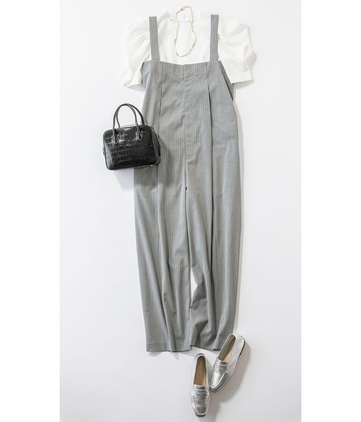 マニッシュ度高めの極細ストライプサロペが甘盛りブラウスと好バランス。白×ライトグレーの夏らしい軽やかコーデ。