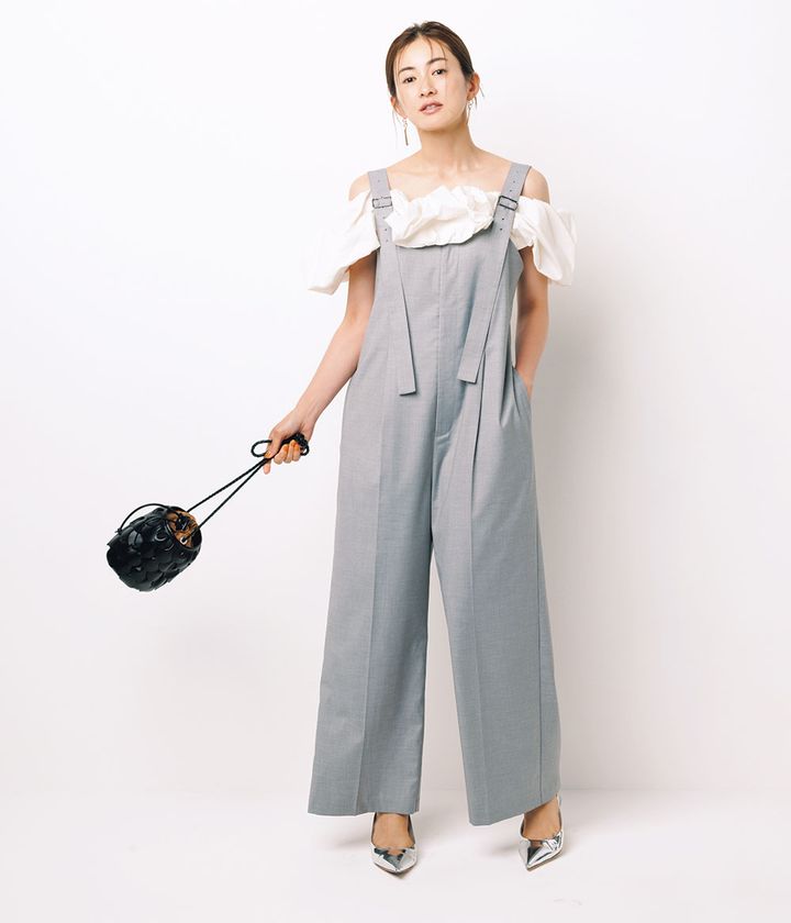 ブラウス¥25,000(シーニュ)サロペット¥27,500(カデュネ)バッグ¥71,500(メゾン カナウ/ヤマニ)ローファー¥27,500(コルソローマ ノーヴェ/WASH ルミネ横浜店)ネックレス¥132,000(ブランイリス/ブランイリス トーキョー)