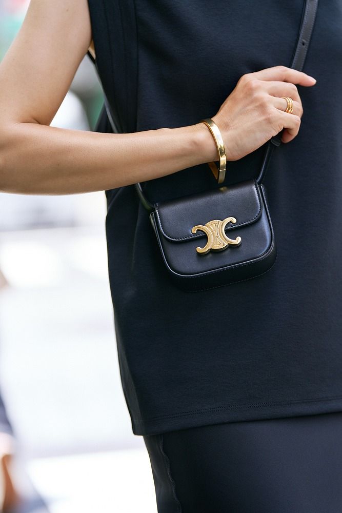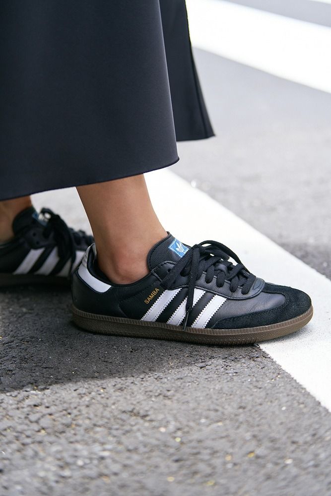 カジュアルが苦手でスニーカーはあまり履かないのですが、サンバのブラックは形が細めでキレイめコーデにもあわせやすいのでお気に入りです。サテンのマーメードスカートが女性らしいアイテムなので、スニーカーでカジュアルダウンしました。オールブラックなので、のっぺりした感じにならないように、素材感やシルエットの綺麗さを意識。セリーヌのミニバッグをポイントにしました。シンプルながらも女性らしく洗練されたカジュアルスタイルに。