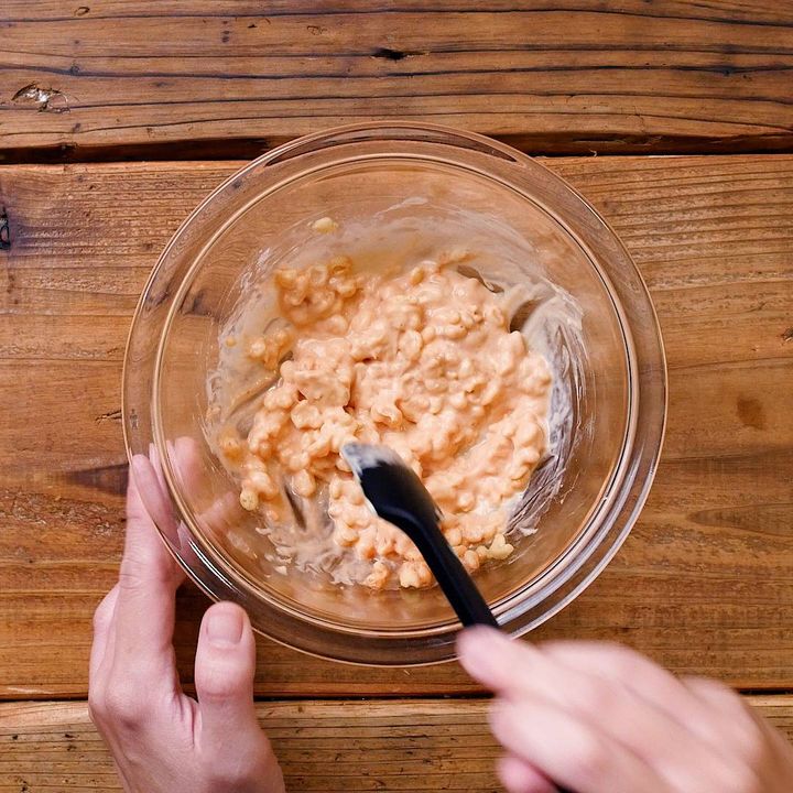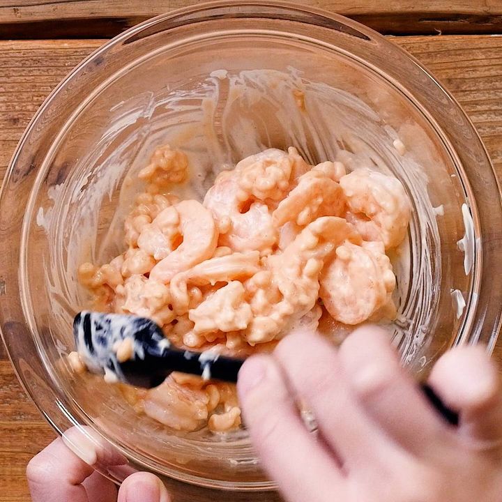 3: ②にえびを加えて和えます。
