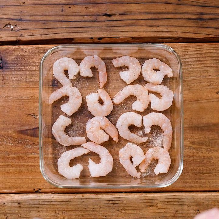 ・冷凍むきえびは塩水で解凍します。