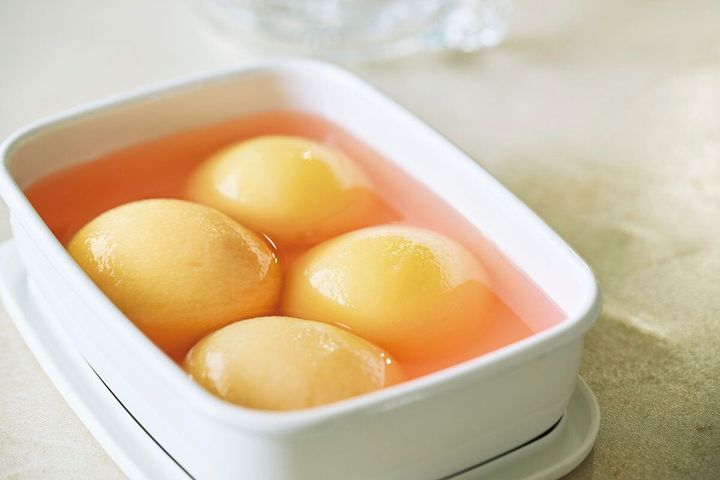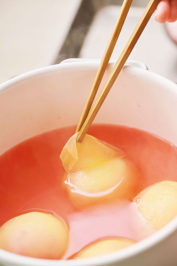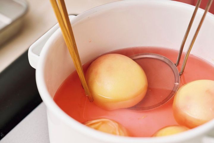 (4)火を止め、粗熱が取れたら菜箸でそっと皮をむく。さめたらコンポート液ごと保存容器に入れる。冷蔵で4~5日保存可能。