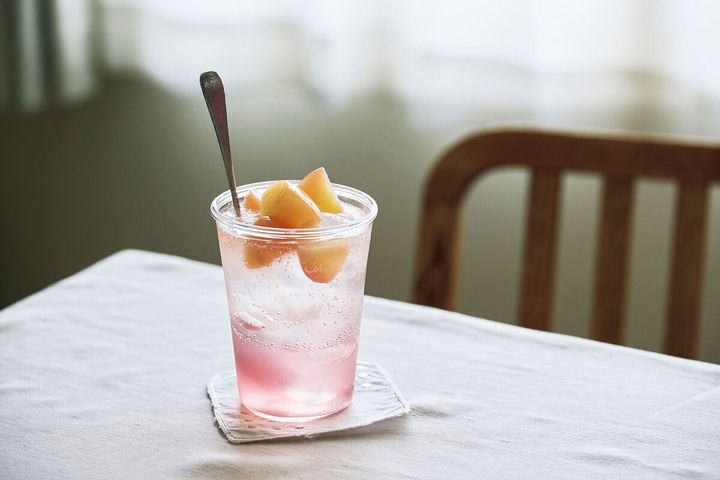 グラスに氷適宜を入れ、コンポート液と炭酸水を1:3の割合で注ぐ。桃のコンポート適宜を食べやすく切ってのせる。