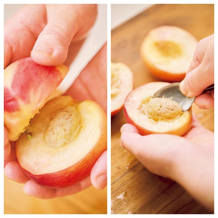(1)桃は割れ目にそってぐるりと一周切り目を入れ、両手でやさしくひねって2つに分ける。種のまわりにスプーンを差し込んで一周し、身をくずさないよう種を取り除く。皮はむかなくてOK。