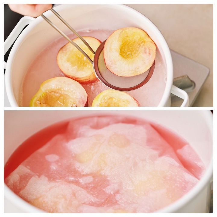 (3)網じゃくしと菜箸などを使い、桃をそっと裏返す。再びペーパータオルで落としぶたをし、さらに3~4分煮る。