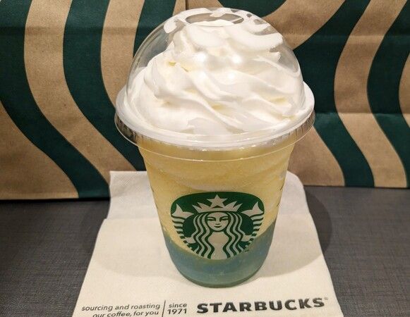 コクのあるホイップクリームとパイナップルジュースベースの甘酸っぱい味わい。シーソルトジェリーの塩味がアクセントとなり、猛暑日にピッタリなさわやかなフラペチーノに仕上がっています。