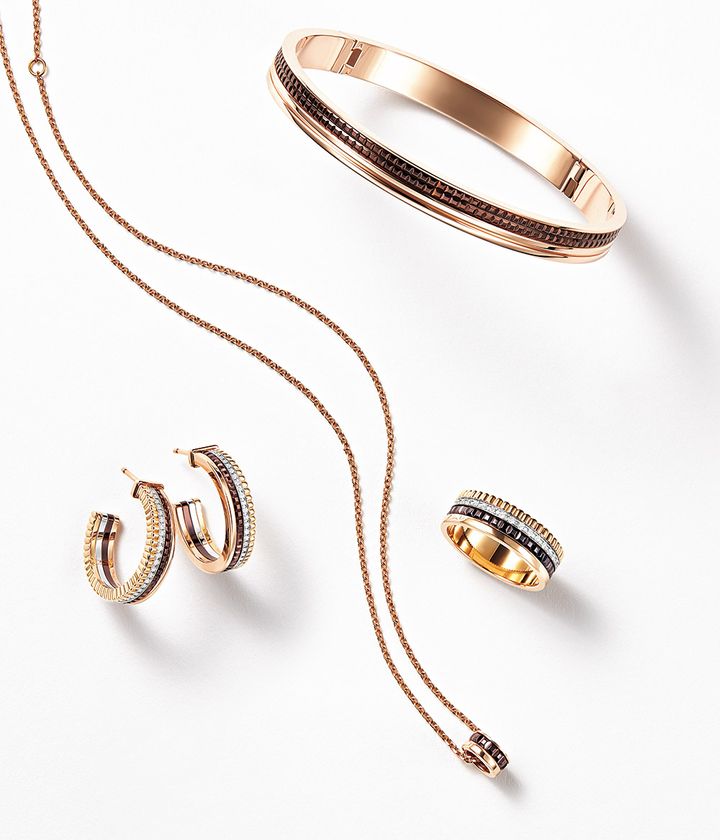 上から時計回りに・「キャトル クラシック」バングル ハーフ ラージ〈YG×PG×ブラウンPVD〉¥1,518,000ダイヤモンド リング スモール〈YG×PG×WG×ブラウンPVD×DIA〉¥1,161,600ペンダント ミニ〈PG×YG×ブラウンPVD〉¥289,300フープイヤリング スモール〈YG×PG×WG×ブラウンPVD×DIA〉¥1,069,200※すべて予定価格(すべてブシュロン/ブシュロン クライアントサービス)