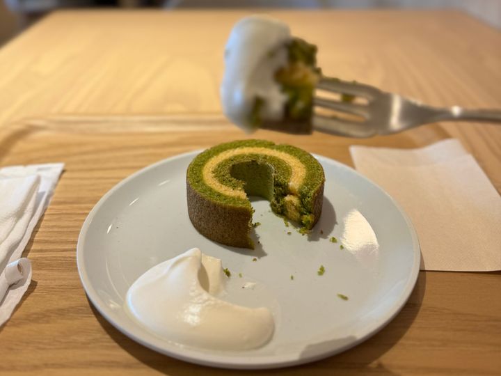 しっとりふわふわで抹茶の濃厚さがしっかり感じられる京ばあむ。甘すぎない生クリームとの相性がとってもよかったです!