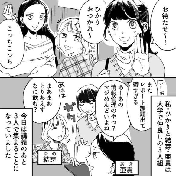 主人公は友だちの結芽と亜貴の3人で集まることに。