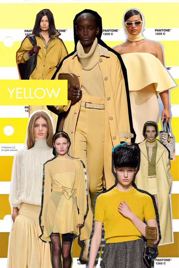 2023-24年秋冬のキーカラーだったイエロー。好き嫌いが分かれる色でもあるが、今冬も人気となりそうな予感。プラダPRADA)では、マリーゴールド色のニットがグレーのスカートと合わせられ、ヴィクトリア・ベッカムVICTORIA BECKHAM)やジャックムス(JACQUEMUS)ボッテガ・ヴェネタBOTTEGA VENETA)では、バターのような柔らかな色彩が美しく落とし込まれた。PANTONE®のカラー・トレンド・レポートでも、自然界の美しさを反映する色として、程よいスパイスの効いた「ミステッド・イエロー」がハイライトされている。
