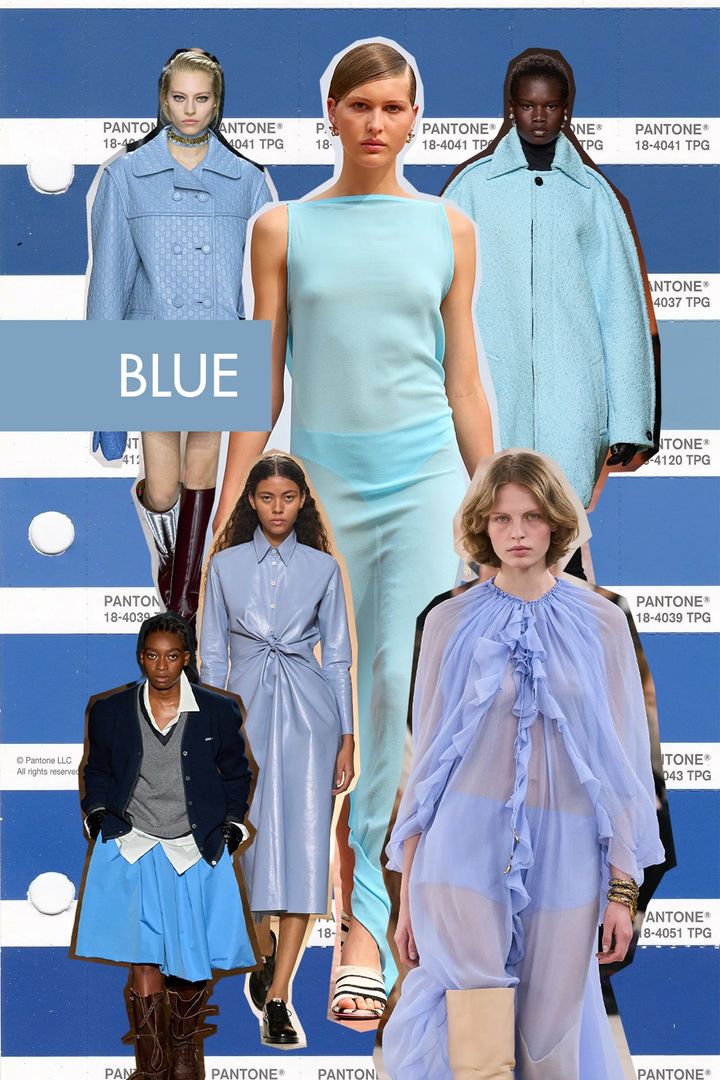 冬のコレクションでは常にブルーが主流だが、今年はネイビーやロイヤルブルーだけでなく、スカイブルーやコバルトといった淡いトーンもミックスされている。ボッテガ・ヴェネタBOTTEGA VENETA)による鮮やかなスカイブルーのコクーンコートや、ミュウミュウMIU MIU)のコバルトブルーのスカートとシャツがその好例だ。PANTONE®のカラー・トレンド・レポートでも、高尚でありながら軽やかな「スターライト・ブルー」とトロピカルな海の青をイメージした「ウェーブ・ライド」の2つ色調が取り上げられている。