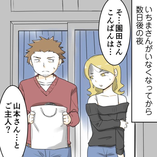 マキさんの親友ミチコさんの娘エリちゃんは、いちまさんの価値に興味津々だった山本さんが、いちまさんをカバンの中に入れるのを見たと言いますが証拠はありません。ミチコさんから山本さんの家に行ってみるか提案があったものの、マキさんはしばらくそのまま様子をみることにしました。