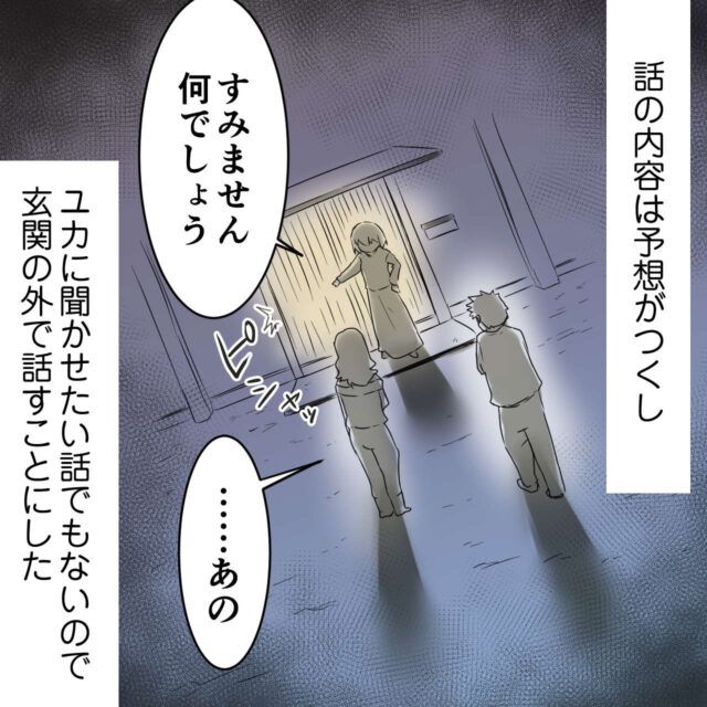 話の内容は想像がつきます。ユカに聞かせたい話でもないので玄関の外で話すことにしました。