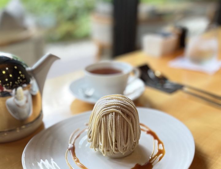 京丹波栗の自然な甘みのクリームの中に、フレッシュな生クリーム、そしてごろんと丸ごと栗が入っています。土台のメレンゲの甘みと相まって、口の中にやさしい味が広がります。紅茶は香り高いアールグレイをいただきました。