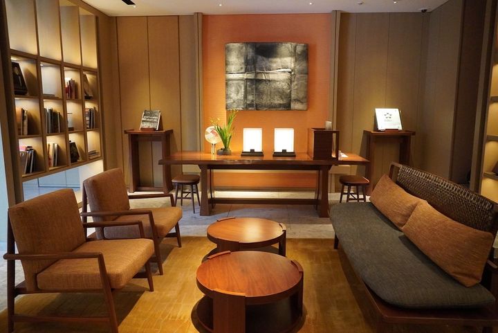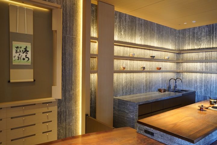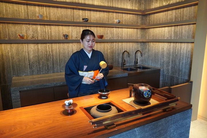 ロビーラウンジ横のお茶室「茶居(ちゃきょ)」では茶道体験ができます。椅子に座ってお茶をいただく立礼(りゅうれい)なので気軽ですね。武者小路千家の家元後嗣の監修によるしつらえや道具は必見。同ホテルのコンセプト、「継承と新生」に共鳴した静かな空間です。