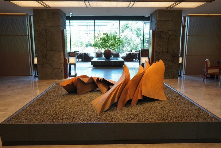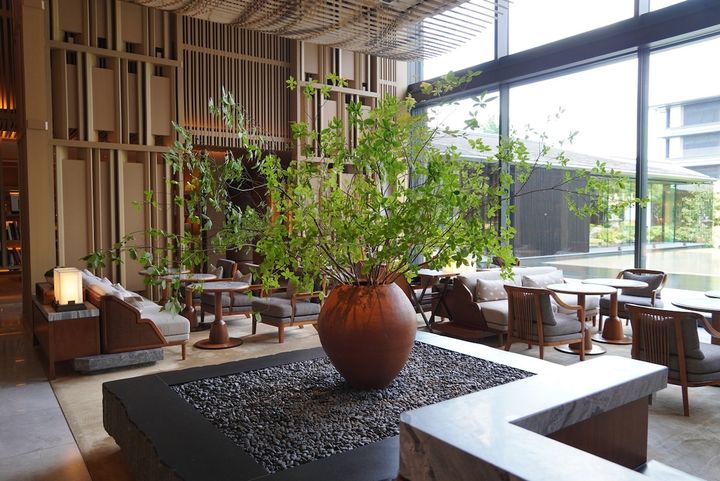 奥にあるロビーラウンジに進むと、美しい庭園が目に飛び込んできました。高い天井と大きなガラス、ロビーとの高低差に感動もひとしお。ロビーの天井が低かったのは、このための演出だったんですね。