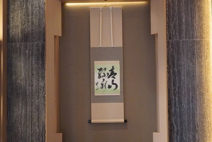 訪れた時の掛け軸は、家元後嗣による「青山緑水」。輝く緑と流れるせせらぎ、涼やかな風が吹いてきたような清々しさを感じます。掛け軸は、季節によって変わります。