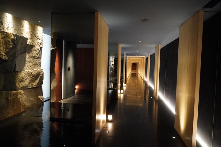 地下に降りると、明かりをおとした廊下が奥に続いて、まるで異空間に迷い込んだよう。静けさと水音で、徐々に心身がクールダウンしていきます。