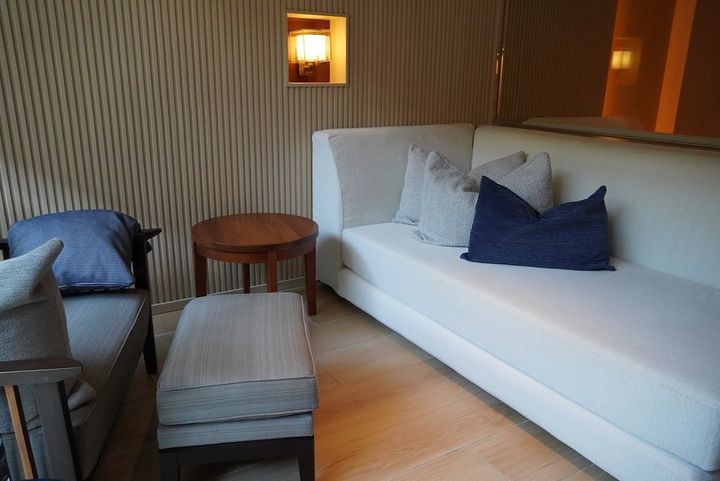 くつろげるソファやインルームダイニングがあるので、ここでルームサービスを取ることもできるんです。朝風呂の後に朝食、なんて贅沢な時間が過ごせますね。「フォーブス・トラベルガイド2024」のスパ部門で4つ星を獲得したと聞いて納得!