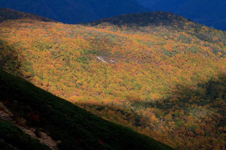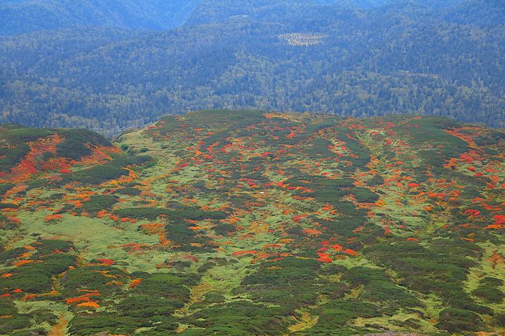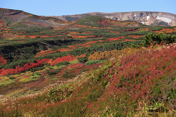 紅葉が始まるのは、背丈の高い木々が生えない高山帯から。厳しい自然環境の森林限界(※1)の山肌を彩るように、パッチワーク状の紅葉が展開します。