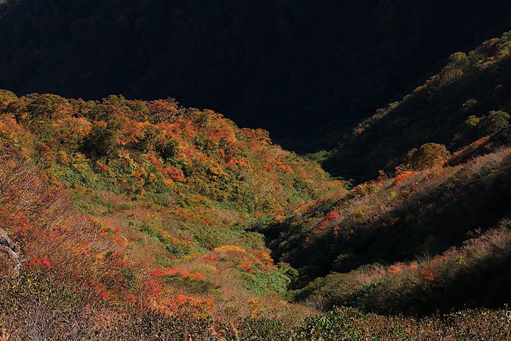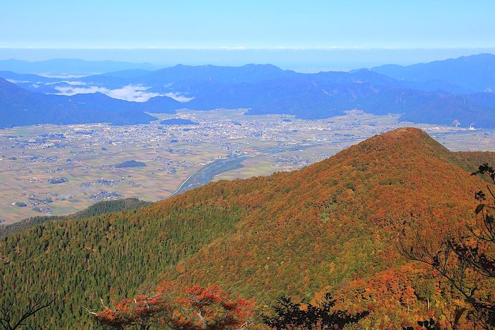 後半に現れる「もちが壁」を越えて、山頂まで至る稜線の終盤を迎えると、眼下の谷にまるで紅葉の屏風のような風景が展開。明暗も相まって、いっそう紅葉の鮮やかさに目を奪われ、大野平野のパノラマも見事です。