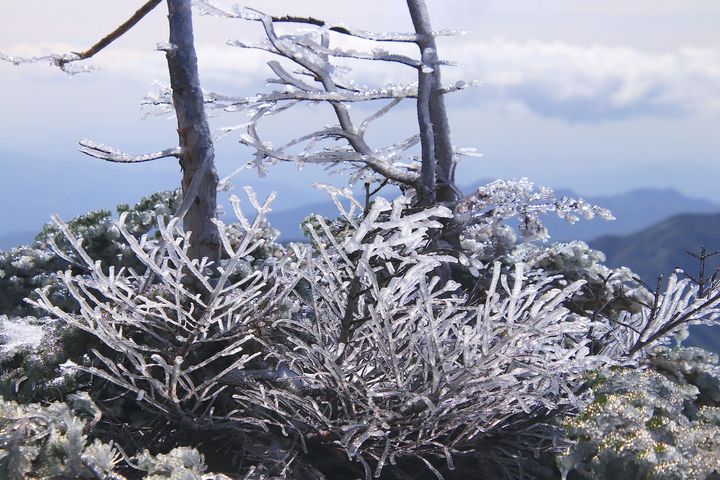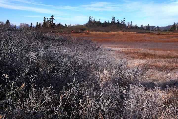 登山道の道中に霧氷(空気中の水分が過冷却により木々に氷結する現象)がみられたり、草紅葉が彩る湿地周辺に霜が降りていたり。秋の深まりとともに冬の足音を感じられる登山は、まさに四季の狭間を移動するような山の旅でした。