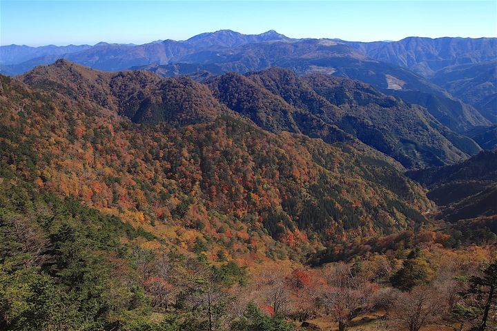 山頂にたどり着くと、そんな原生林の紅葉を見下ろすような大パノラマが展開!金剛堂山(こんごうどうさん、標高1,650m)など岐阜県と富山県の境界をなす山の姿も壮大です。