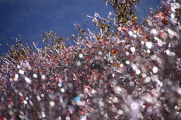 森林限界のハイマツ帯では、ナナカマドが赤く色づき始め、そのうえに雪が積もるだけでなく、霧氷まで形成されました。高山帯全体が霧氷の原っぱと化し、山における季節の逆転現象を目の当たりにしました。