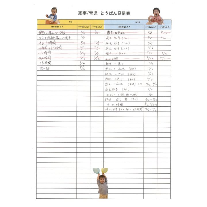 「急遽シフトを代わったり、土日対応などで負担がどちらかに偏った時は、30分単位で貸し借り表に書いていきます。現在ママの貸しが貯まってきているので、旅行などで一気に消化することも検討中♪」