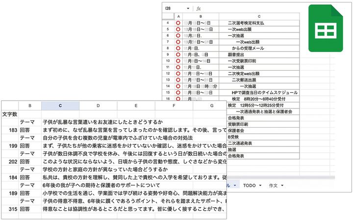 「スケジュール管理のほか、受験内容に保護者の作文もあったので、パパが作文を書いてママがそれにフィードバックを書き込むという過去問対策をスプレッドシート上でおこなっていました。作文の練習を通じて、お互いの子育ての価値観をすり合わせる良い機会にもなりました!」