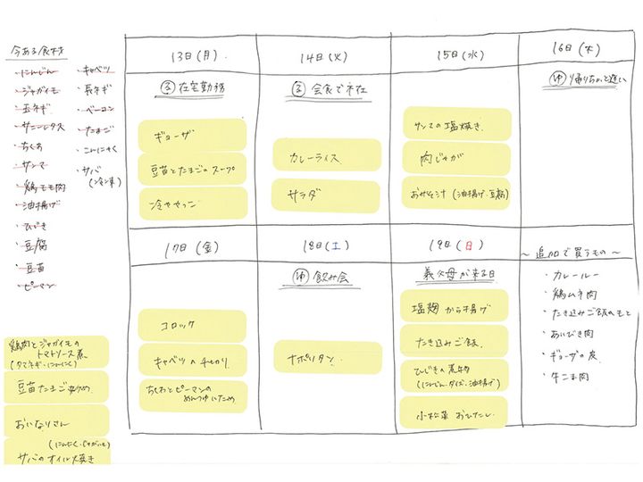 「週1回、食材を付箋に1つずつ書き出して賞味期限や優先順位を確認。今ある食材で作れる献立も付箋に書き出して整理しておけば、あとは順番に作っていくだけ。今日ご飯どうしよう…と悩む時間が減らせます」