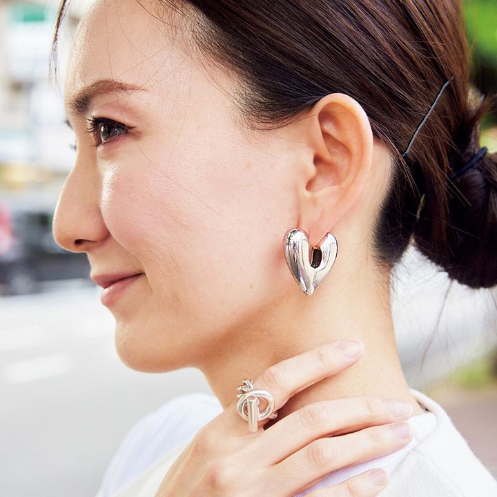 元々ジュエリーはゴールド派でしたが、最近シルバーを取り入れるようになりその使いやすさに目覚めました!アニカイネズのハートモチーフは一見甘さが出そうですが、シルバーなので存在感が強すぎずモードなスタイリングにもさらっとつけられます。