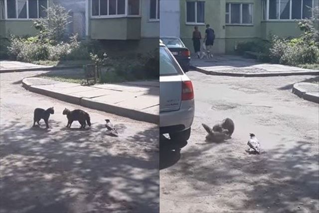 2匹の猫がケンカ!仲裁に入ったのはまさかのカラス!?いったいどうやってケンカを止めるの?