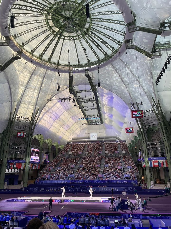 フェンシングの試合会場だったグランパレは、1900年のパリ万博のために作られたガラス張りの屋根が印象的な建物。パリの名所の一つでもあるこの建物を舞台にした試合は壮観でした! 夏は21時でもまだ明るいパリ。日中も夜も選手が眩しくないように、ガラス張りの屋根に幕を張って、景観を崩さずに上手く工夫をしつつ既存の建物を生かして会場にするアイデアが素晴らしかったです。