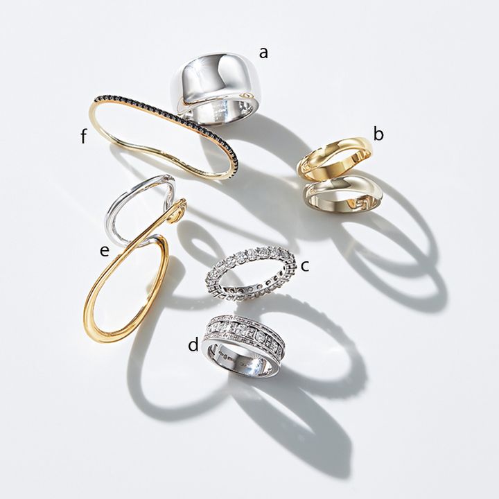 a.カルティエのヌーベルバーグは廃番前に買って正解!b.ともにカルティエの地金リング。イエローとホワイトの2本セットでカラーミックスをするときの軸に。c.ダイヤのエタニティはノーブランドで。d.初ダイヤのダミアーニ・ベルエポックは永く使えそうなデザインに惹かれて。e.プラスヴァンドームのイヤカフ。f.プラスヴァンドームのファインラインタトゥーのダブルフィンガーリングはグレージュのジルコニアの色味も絶妙。
