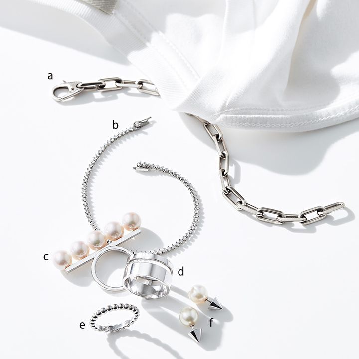 a.カルティエのサントスのブレスレットは、ネックレスの万能さに開眼して買い足したもの。b.ダイヤのテニスブレスはオーダーで。c.母行事に役立つひとクセパールが欲しくて、タサキのバランスを今年に入って新調。d.レポシのベルベル リングはソリッドなオール地金タイプに。e.VCAのペルレはとにかく使い勝手抜群!f.10年以上愛用し投資の価値は十分なタサキのピアス。