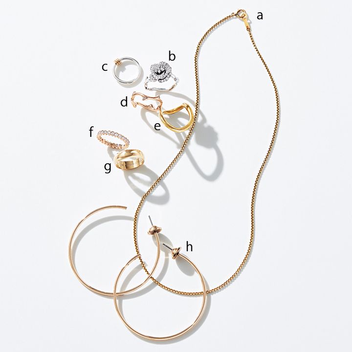 a.叔母から譲られたYGのチェーンネックレス。b.リアルなバラのフォルムにキュンとしたローズ ディオール バガテルは40歳の記念に。c.ピンキーリングはヒロタカ。d.ディオールのボワ ドゥ ローズは他にはないバラの茎モチーフに惹かれて。e.指長効果大のシンパシーオブソウルスタイル-のリングはシルバーと色違いで。f.g.一味違うデザインを探したエタニティとマリッジはカルティエ。h.フープはファッションアイテムとして選んだZARA。