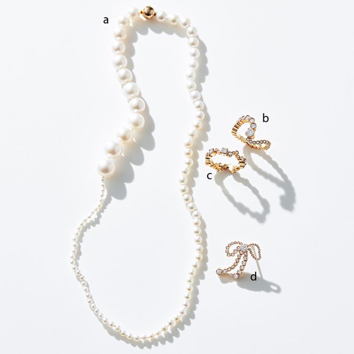 a.〜c.はすべて偏愛するソフィ・ビル・ブラーエのもの。a.大小の粒を並べたアイコニックなデザインはパールネックレスでも健在♡ b.大胆な曲線を描くリングは華奢ながら一点でインパクト大。c.結婚指輪のバブルモチーフリングがこのブランドの魅力に開眼するきっかけに。d.揺れ感も魅力のダイヤのリボンモチーフピアス。片耳売りが多いSBBのピアスですが、アシンメトリーに甘さを盛るモード感も新鮮。